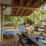 Two small bedrooms, a large living room with couch, which can be transformed into a bed for two, a dining room, a kitchen, a bathroom equipped with shower and toilet can be found in the fully furnished and equipped mobilehome. There is a covered terrace with garden furniture in front of the house. We offer the mobilhome for 4 adults and 2 children, or for 5 adults.