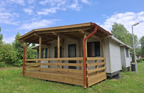 We offer the 18 m2 mobilhome for max. 2 adults. The mobile home is a studio, in which a bedroom, a kitchen with dining room, comfortable armchairs and a dining table are located in one space. There is a bathroom with shower (with hair dryer) and a toilet. You can relax on the covered terrace with garden furniture in front of the house. The mobilehomes are equipped with a television and an air...
