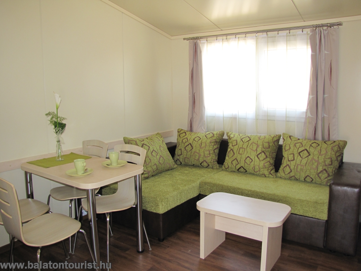 In dem vollkommen eingerichteten und ausgestatteten Mobilhome gibt es zwei Schlafzimmer, eine Wohnküche, Bad mit Dusche und Wc. Das Eckbettsofa in der Wohnküche ist ausziehbar, man kann sie zu einem bequemen Bett umwandeln. Vor den Häusern gibt es eine überdachte Terrasse, mit Gartenmöbel. Wir empfehlen das Mobilhome für max. 4 Erwachsene und 2 Kinder oder max. 5 Erwachsene.