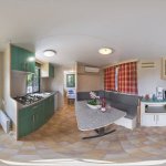 Die Mobilhome mit AC sind zur Unterbringung von max. 4 Erwachsene und 2 Kinder oder max. 5 Erwachsene geeignet. Alle Mobilhome haben 2 Schlafzimmer (1 Doppelzimmer und 1 Zweibettzimmer), Wohnzimmer mit Eckbettsofa, Küche, Dusche, Toilette, Terrasse mit Gartenmöbel.